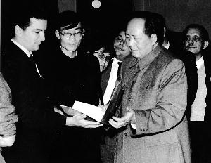 毛主席與外國(guó)友人親切交談,筆者(左二)在當(dāng)真翻譯。